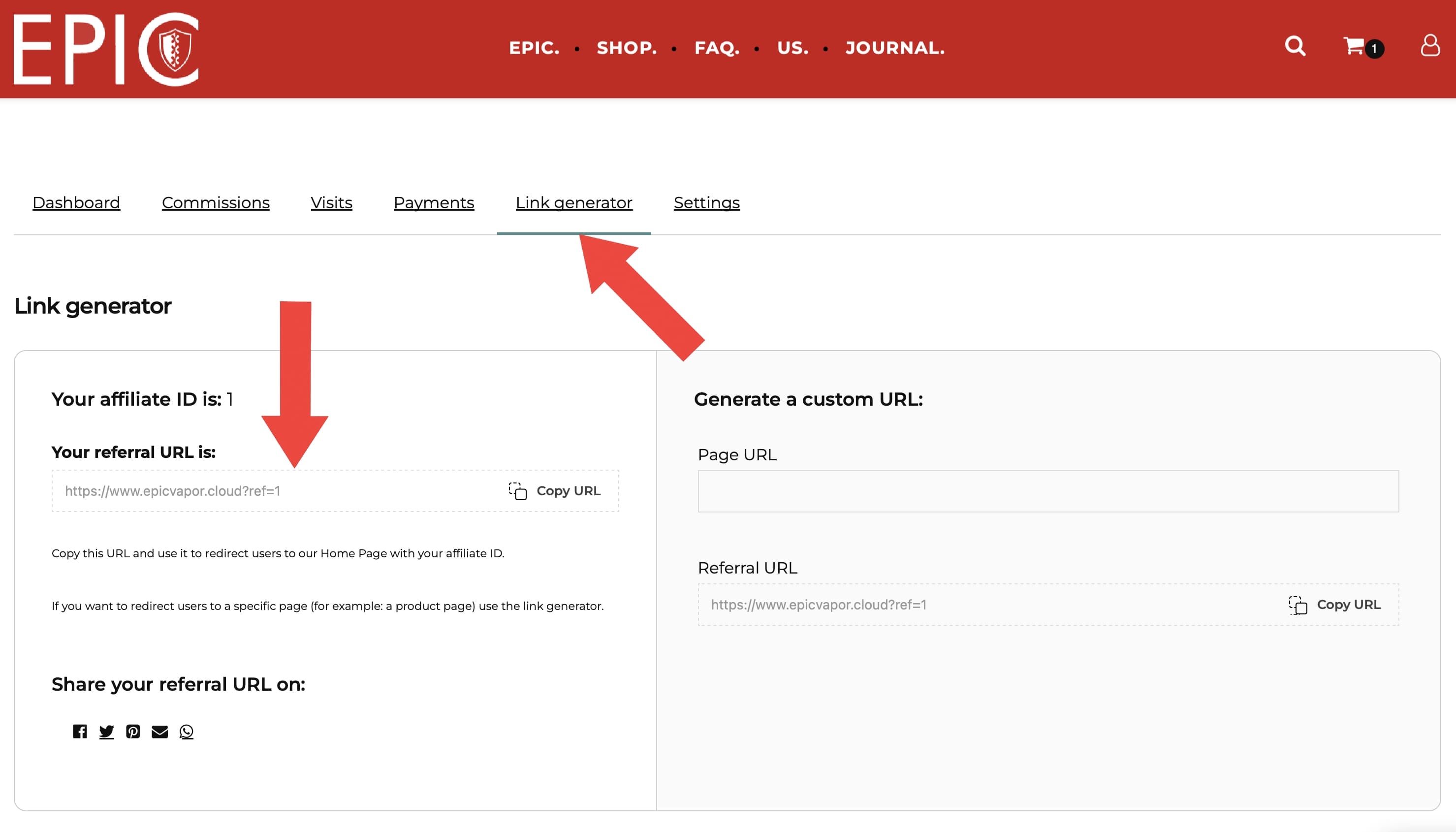 When you sign up for EPIC FRIENDS you have your own unique affiliate link. This can be found in the EPIC FRIENDS affiliate dashboard (link below) under the tab “Link generator”. Copy the link. You can then share it with friend, family, online and on social media. So text it, email it, post it on social media. When they buy, you get EPIC CASH our in store credits.