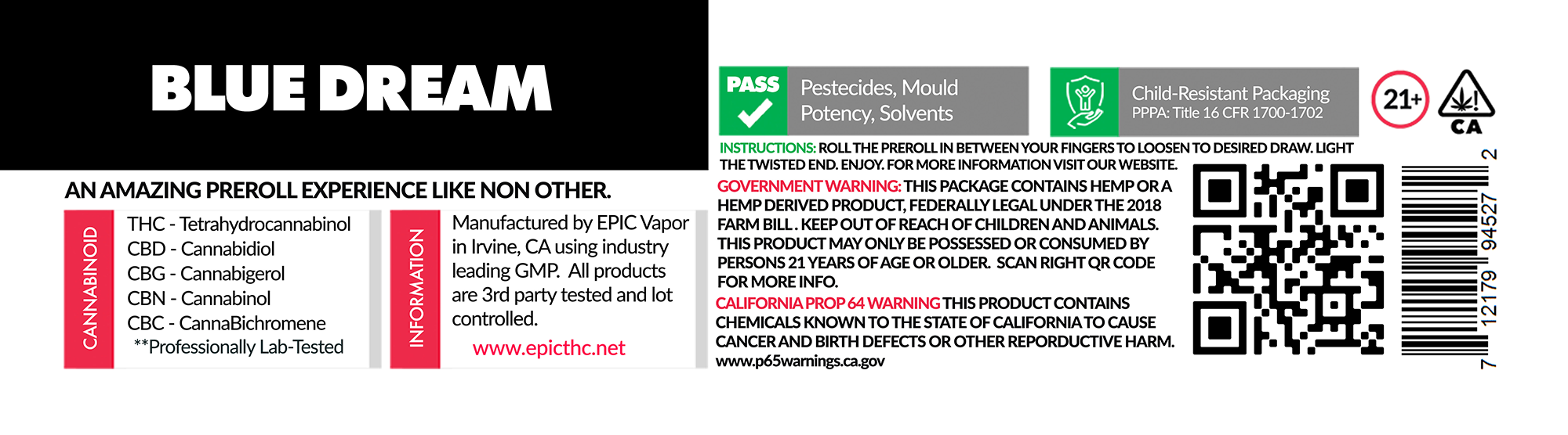 Our preroll is made through a multi-step infusion process. Step one is to select premium flowers. Once these are selected, it is time to coat them with infused distillate oil. This process often involves multiple coats on the flower to increase psychoactivity and provide an overall frostier look. Packaged to maintain freshness using an 8 layer patented pouch package with a ziplock mechanism. Which further serves as a child proof package with California state compliance labelling. You can be certain that when you buy an EPIC preroll, you are getting the absolute best product available in the world. We take tremendous pride in says as much. After all our brand is EPIC, which means the flower has to be EPIC.