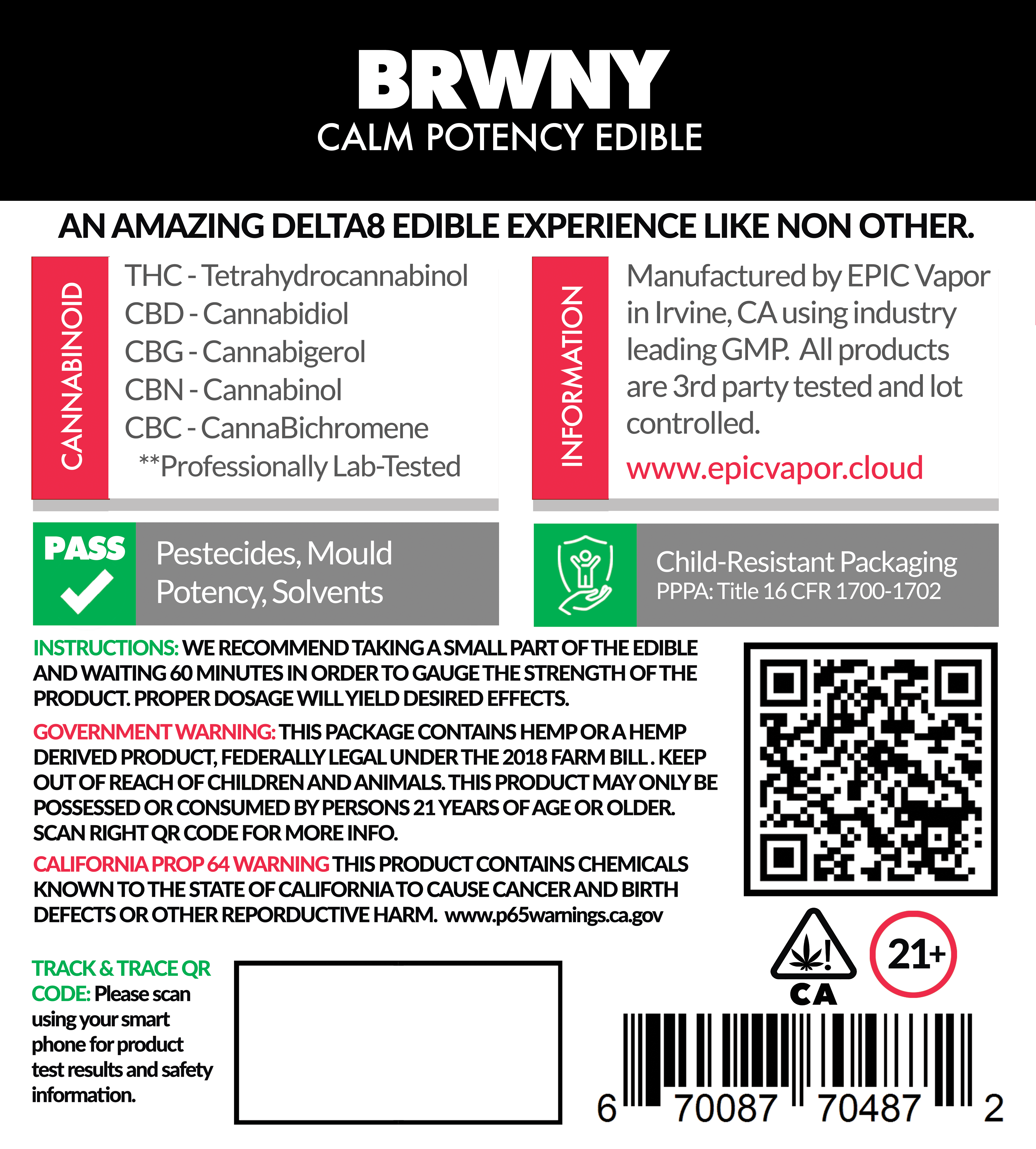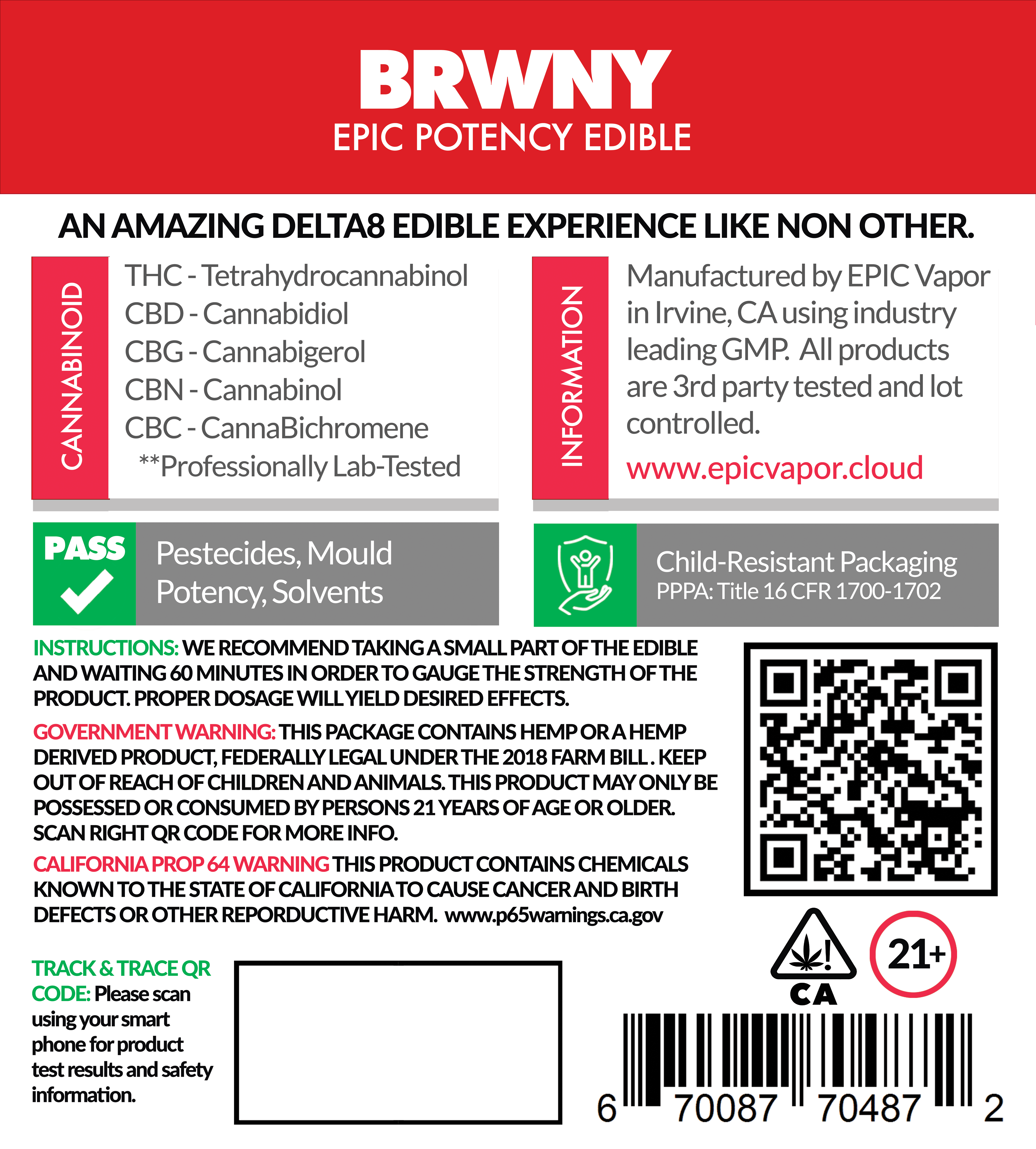 Our edibles are made from the purest full spectrum distillate. Crafted in a sterile commerical kitchen and made under GMP requirements for food products. Packaged to maintain freshness using an 8 layer patented pouch package with a ziplock mechanism. Which further serves as a child proof package with California state compliance labelling. You can be certain that when you buy an EPIC edible, you are getting the absolute best product available in the world. We take tremendous pride in says as much. After all our brand is EPIC, which means the edible has to be EPIC.