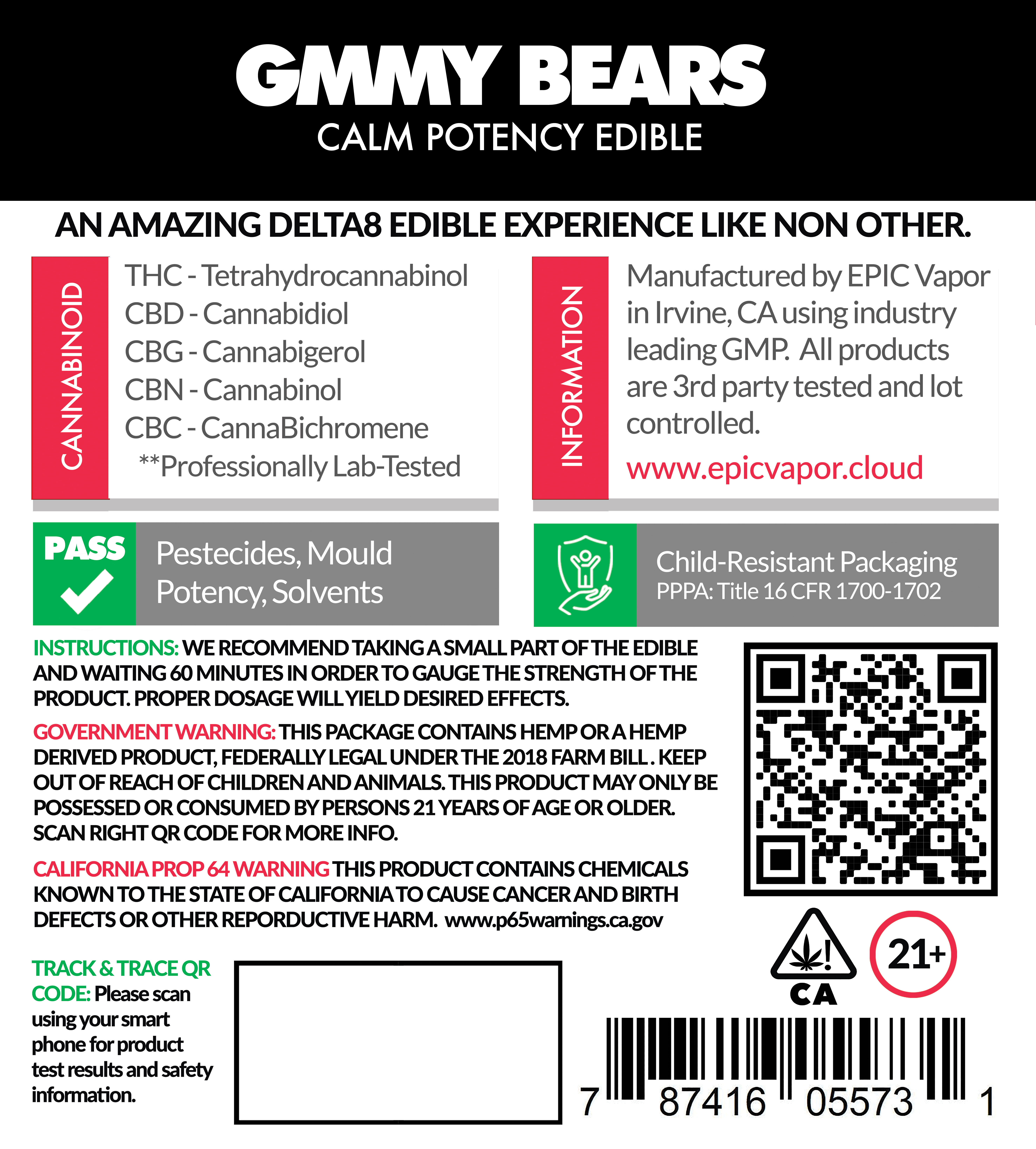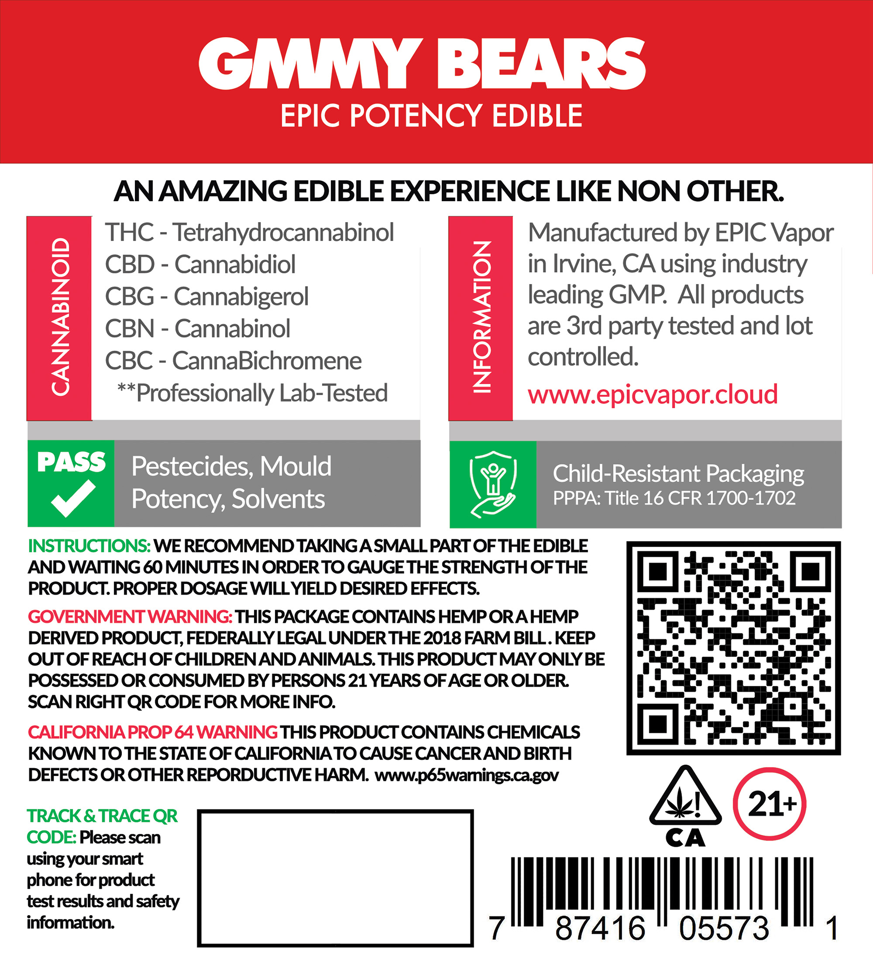 Our edibles are made from the purest full spectrum distillate. Crafted in a sterile commerical kitchen and made under GMP requirements for food products. Packaged to maintain freshness using an 8 layer patented pouch package with a ziplock mechanism. Which further serves as a child proof package with California state compliance labelling. You can be certain that when you buy an EPIC edible, you are getting the absolute best product available in the world. We take tremendous pride in says as much. After all our brand is EPIC, which means the edible has to be EPIC.